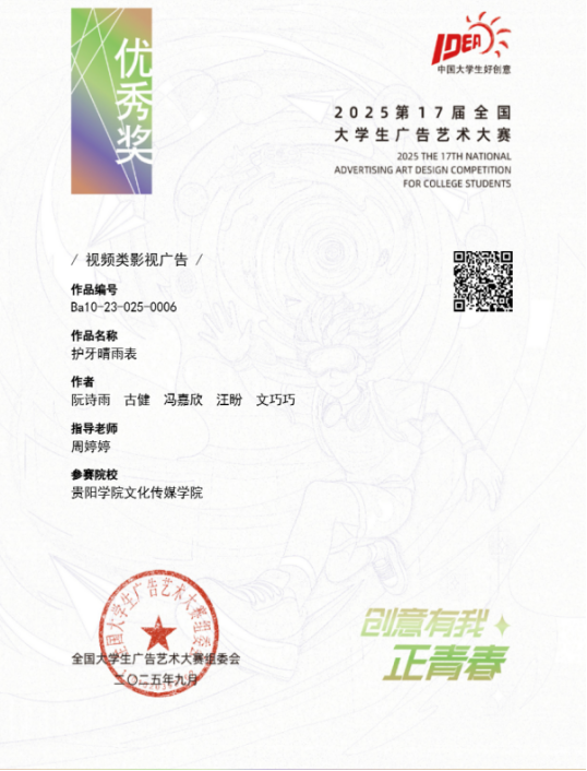 赛事期间,公司领导高度重视,多次鼓励师生以赛促学。广电学子们也积极参赛,创作出一个又一个的优秀作品。从作品《人人公益爱无代际》传递的公益温度,到《HBN让你焕发自然光泽》展现了品牌的魅力,再到《护牙晴雨表》聚焦身体健康守护,广电学子们深入挖掘命题内涵,将专业知识融入到创意实践中。