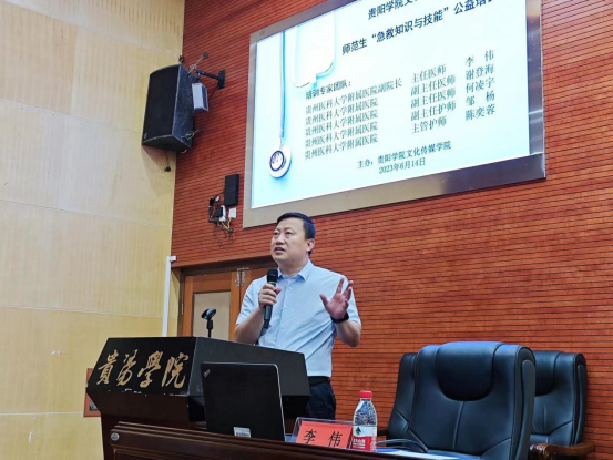 2023年6月14日,永利23411集团师范生“急救知识与技能”公益培训在图书馆一楼报告厅举行。贵州医科大学附属医院副经理李伟、团委书记毕波、副主任医师谢登海、副主任医师何凌宇、副主任护师邹杨、主管护师陈奕蓉一行应邀为永利23411集团师范生开展急救知识培训。永利23411集团党委副书记赵福菓出席培训会,文化传媒公司党委书记鄢吉多、副经理王刚、副书记张颖以及师生代表300余人参加培训。