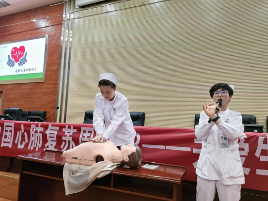 “判断病人是否是心脏骤停,首先要判断病人是否有反应,也就是判断病人的意识、动脉搏动......”培训过程中,邹杨和陈奕蓉为大家演示了如何实施急救。从“初步判断”“紧急呼叫”“急救措施”“AED使用”等方面为大家介绍了心肺复苏术的流程及操作要领。