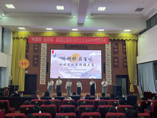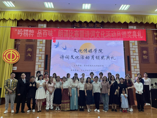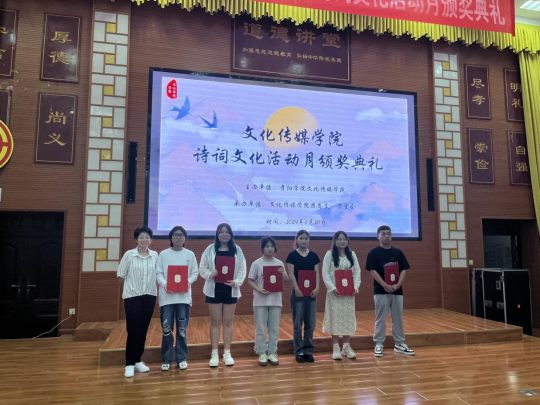 比赛环节结束后,各位嘉宾和评委老师分别为“万象飞花”“潇洒一笔展风韵”“提笔效诗仙”三个诗词文化月系列比赛的获奖者颁奖,随后,“吟精粹 品百味”朗诵比赛的获奖结果揭晓:《梦里的唐诗》荣获一等奖,《唐诗里的中国人》《如果没有李白》《长恨歌》三部作品并列荣获二等奖,《寻李白》《相思》《春江花月夜》荣获三等奖,《将进酒》荣获优秀奖。最后,文化传媒公司党委副书记张颖为本次比赛及颁奖仪式致辞,她谈道:此次活动让她感受到了古典诗词之美,推动了诗词文化的传播,发扬了中华优秀传统文化,增强了同学们的文化自信。此次比赛及颁奖仪式在掌声中圆满落幕。