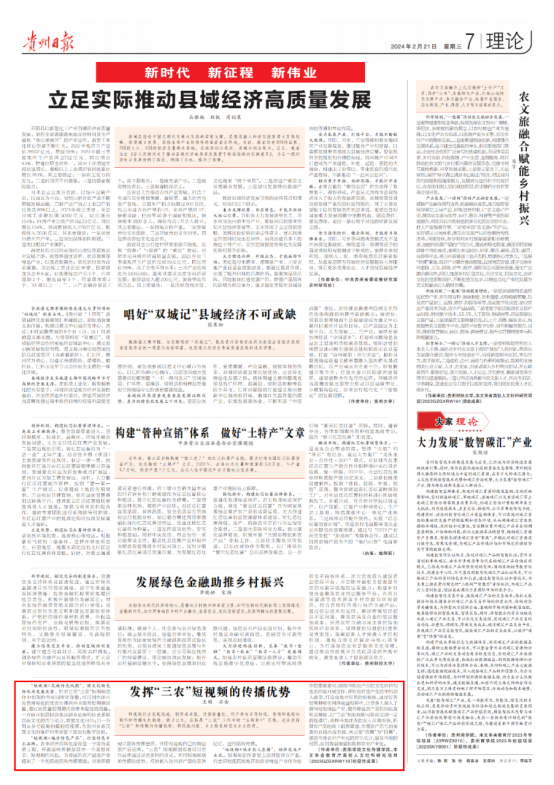2024年2月21日,《贵州日报》理论版刊发公司王刚教授、石金高级实验师撰写的理论文章《发挥“三农”短视频的传播优势》。
