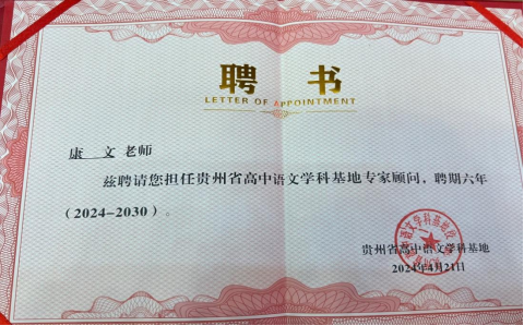 2024年4月,永利23411集团汉语言文学教研室主任康文教授被聘为“贵州省高中语文学科基地”专家顾问。康文教授长期致力于高中语文公司产品研究,此次被聘请为“贵州省高中语文学科基地”专家顾问,将进一步引领公司汉语言文学专业(师范类)与中学语文教育一线的融合发展。