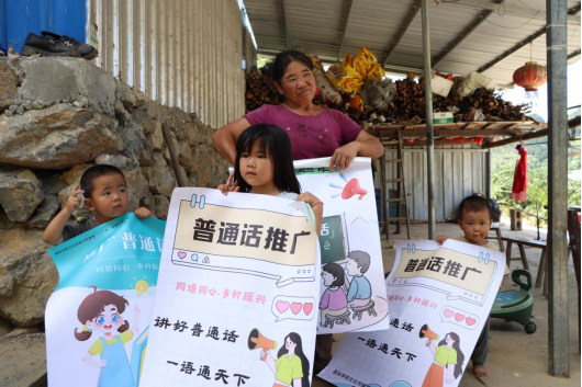 在沿河县淇滩镇、板场镇及其下辖的村寨,同学们走进农家进行普通话使用情况调研,并指导小朋友们掌握普通话读音。