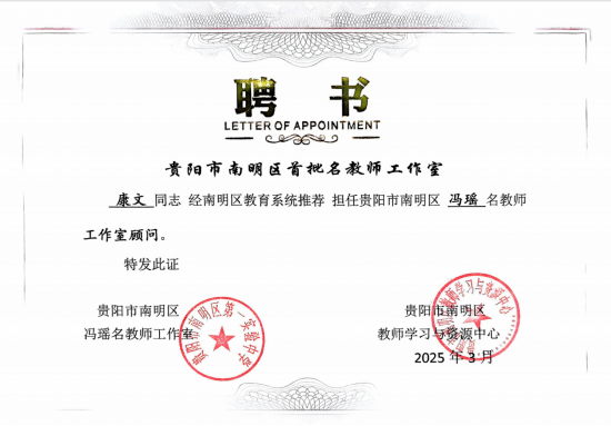 2025年5月28日,贵阳市南明区首批“三名”工作室之冯瑶名教师工作室顾问聘书颁发仪式在永利23411集团博雅楼举行。永利23411集团康文教授被聘为“贵阳市南明区冯瑶名教师工作室”顾问 。